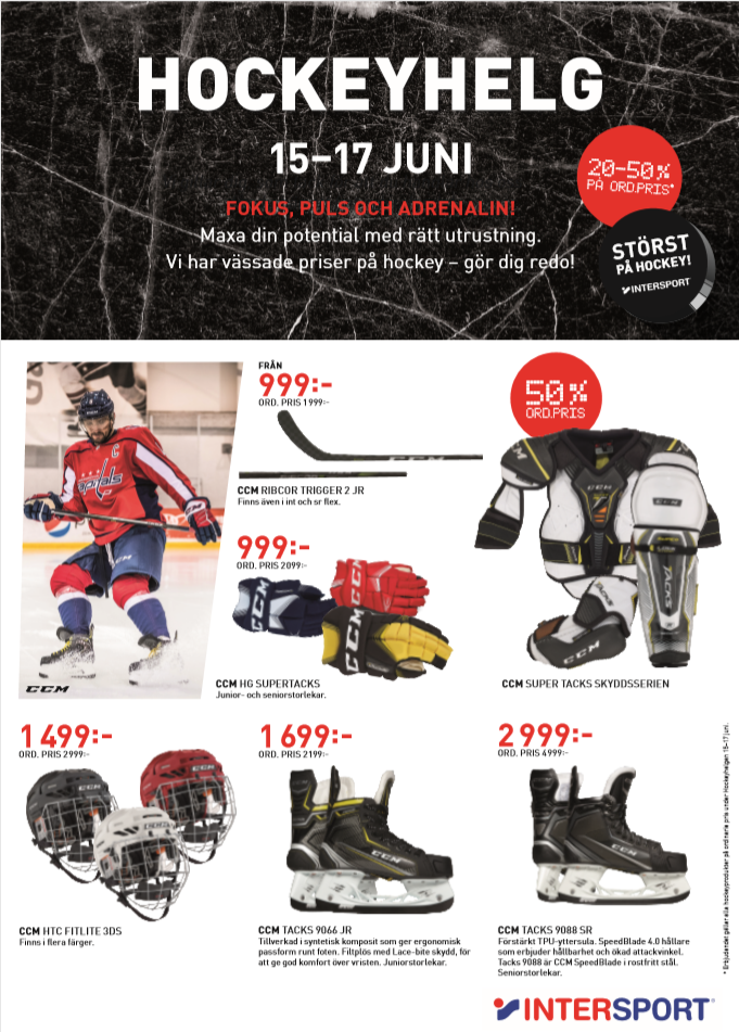 Den 15-17 juni har de ”Hockeyhelg” med massa bra erbjudanden för att göra dina hockeydrömmar verkliga. Vi ses på Intersport Stora Bernstorp – störst på hockey! Utöver våra fantastiska erbjudanden så har vi 20% rabatt på alla ordinarie priser på hockeyavdelningen. På lördagen den 16 juni 11.00-13.00 har vi besök av Redhawksspelare som skriver autografer och annat. Detta året har vi laddat med fler säljare i butiken för att öka servicen. Se alla produkter här:https://www.intersport.se/ishockey U20 13 jun 2018