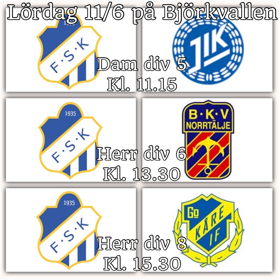 Nu på lördag den 11/6 spelas 3 matcher på Björkvallen. Först ut är Damerna som tar emot det Åländska laget Jomala, matchstart 11.15. Sen spelar herr div 6 mot BKV Norrtälje 2, matchstart 13.30. Ett derby i herr div 8 avslutar heldagen på Björkvallen, Goif Kåre 2 står för motståndet och matchen börjar 15.30. Kiosken kommer vara öppen! Välkomna till Björkvallen och heja fram våra lag till 9 poäng!