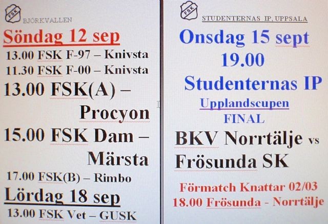 Matcher 12-18 september Frösunda Sportklubb 23 aug 2010 0kommentarer