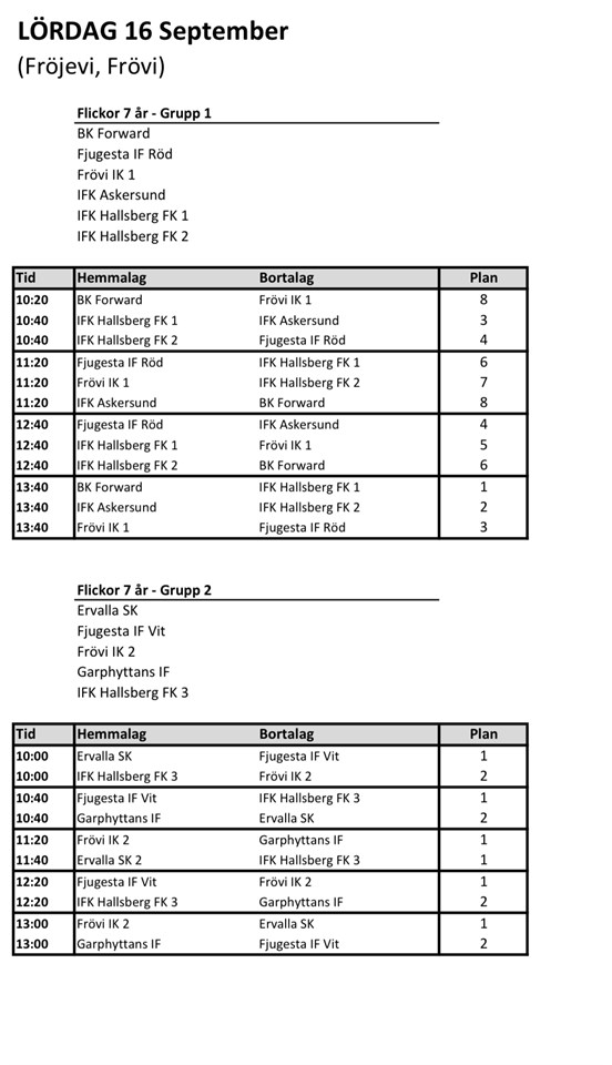 Nu är vi laddade inför fotbollsfest på Fröjevi på lördag! Vi har fått ett något ändrat spelschema då vi anmält två flicklag denna gång. Lagen kommer att vara flexibla under dagen, vilket innebär att tjejerna kan komma att spela i både lag 1 och lag 2. Vi startar med gemensam samling vid plan 2 kl 9.30 som planerat. Medtag strumpor, shorts och vattenflaska. I den bifogade filen finns spelschema. Välkomna! Mvh ledarna genom Marit
