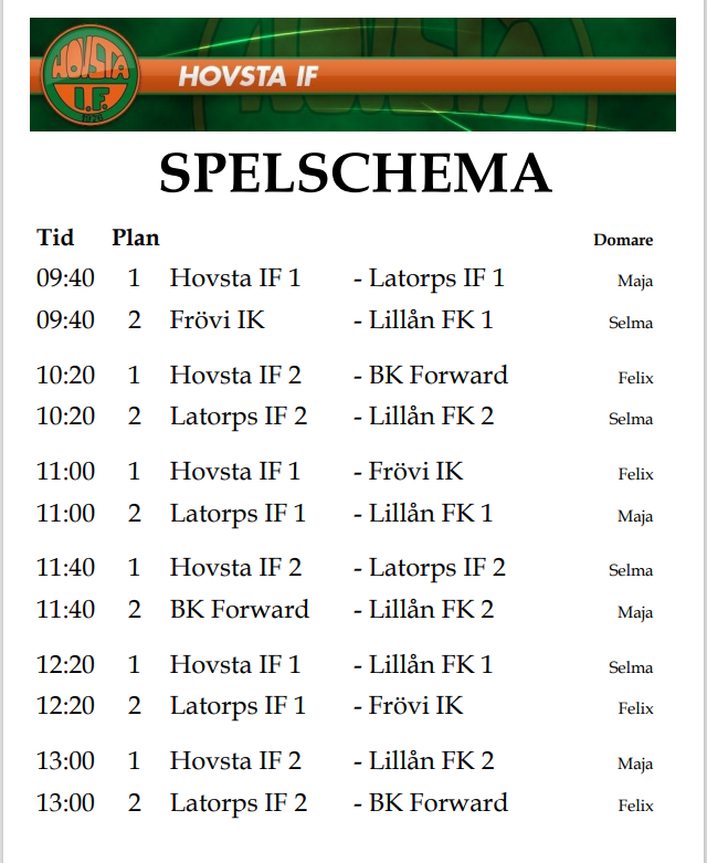 Praktisk information för Hovsta Höstcup 2023 Matcherna spelas på B-plan på Hovsta IP söndagen den 24 september. Vi samlas där kl 09:10. Vi följer förbundets spelregler 5mot5. Matcherna spelas 2x15 minuter. Vi spelar utan resultat och tabeller. Alla lag spelar tre matcher vardera. Domare är utbildade aktiva Hovsta IF-ungdomar. Parkering Det finns parkeringsplatser vid Hovstaskolans Idrottshall och i Hovsta centrum. Det är begränsat antal platser så samåk gärna! OBS! P-skiva krävs. Kiosk Kiosken erbjuder bland annat korv med bröd, hamburgare, festis, läsk, kaffe och hembakat. Faciliteter Det finns omklädningsrum och toaletter i klubbstugan där det även finns god tillgång till handtvätt och handdesinfektionsmedel. Plocka undan skräp efter dig – använd papperskorgarna. Vi hoppas på bra väder och glada barn // Ledarna
