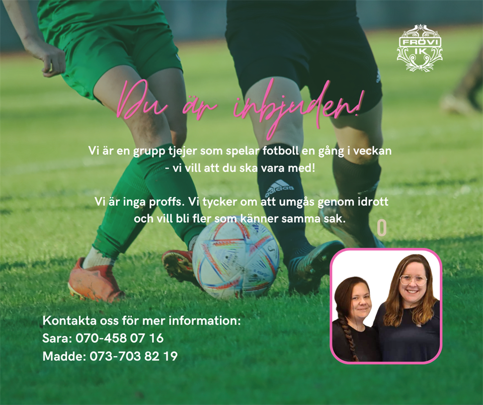 Vi älskar när ni vill engagera er!💙 Tjejgruppen är ett perfekt exempel på att individer kan skapa möjligheter för fler. Sara och Madde kom till oss och ville spela fotboll - så de drog igång och har sedan dess tränat fotboll tillsammans, både utomhus och inomhus. Gruppen består av ett gäng kvinnor i blandade åldrar som gillar att umgås genom aktivitet. De är inga proffs utan alla är välkomna att vara med - oavsett tidigare erfarenhet - det viktigaste är att du vill! Just nu tränar de i sporthallen på lördagar kl 10:30-11:30. Vill du vara med kontaktar du Madde eller Sara. Kostnaden är ett stödmedlemskap i Frövi IK på 250kr/år. Har du en idé eller vision om något du vill göra? Kontakta kansliet på froviik@outlook.com så dricker vi kaffe och pratar mer! 💙 #framåtfrövi Frövi IK 26 feb 2024 0kommentarer