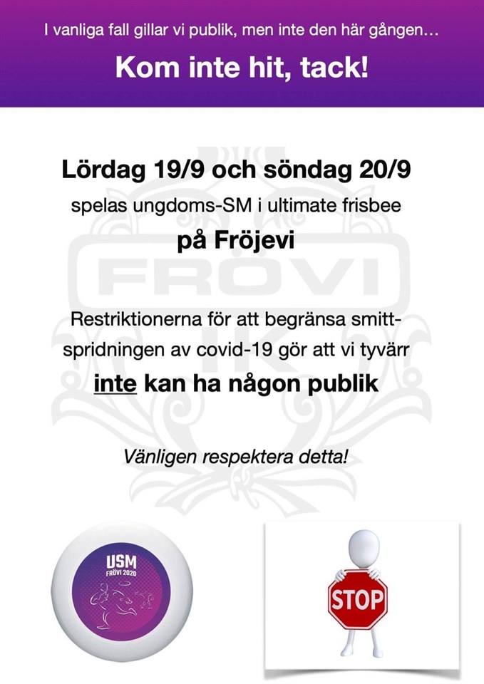 Nu i helgen 19-20 september så spelas USM i Ultimate Frisbee nere på Fröjevi med närmare 30 anmälda lag. Vi har sedan tidigare fått ett tillstånd av polisen för att arrangera turneringen och vi kommer självklart att följa folkhälsomyndighetens rekommendationer. Just därför kommer vi att arrangera USM utan publik den här gången. För dig som ändå känner att du vill vara på plats under helgen så går det bra att anmäla sig som funktionär. Är du intresserad av detta så mejlar du till froviik@outlook.com Målsättningen är även att livesända alla matcher via Solidsport. Mer info om detta kommer senare under veckan. Vi i Frövi IK är oerhört stolta att få arrangera USM och vi är många som ser fram emot helgen. Frövi IK 14 sep 2020 0kommentarer