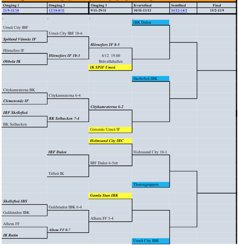 Torsdag den 3 december kliver Gamla Stan in i distriktsmästerskapen (DM), med match mot division 3 laget Alhem. Matchen spelas på Eddahallen med matchstart strax före kl 21. Det blir snabba ryck ibland! Redan nu på torsdag den 3 december möter vi Alhem i tredje omgången i DM. Hur slutspelsträdet ser ut ser ni i bilden ovan. Matchen mot Alhem kommer att spelas på vår träningstid i Eddahallen och startas senast kl 21 (kan ev komma igång lite tidigare). Matchen spelas med rullande tid förutom sista tre minuterna av matchen. Segraren går till kvartsfinal där Umeå City väntar. Till torsdagsmatchen är det gratis entré, så vill du se är det bara att dyka upp. Välkommen! Truppen till matchen är som följer: Målvakter: Kasper Hellgren och John Gren. Backar: Melker Westerberg, Robin Andersson, Philip Ohlin, Tim Bergstedt, Anton Lahti och Erik Dahlén. Forwards: Fabian Lischer, Pontus Nilsson, Erik Hedström, Magnus Ström, Jacob Wik Persson, Carl Jonsson, Oscar Hedström, John Sjöstedt och Fabian Karlstén.