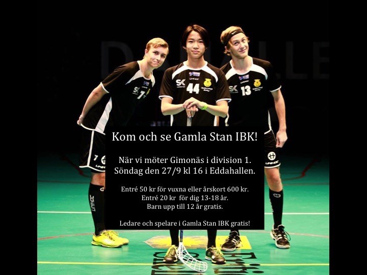 Kom och se oss ta emot Gimonäs söndag den 27 september kl 16, då vi spelar första hemmamatchen för säsongen i division 1. Köp gärna säsongskort som finns till försäljning för 600 kr nu i inledningen av serien. Efter att endast spelat matcher på bortaplan under hela försäsongen är det nu äntligen dags för hemmapremiär. Den går som sagt av stapeln söndag kl 16 i Eddahallen. Ni har då chansen att se våra nyförvärv Philip Ohlin, Erik Hedström och Oscar Hedström i Gamla Stans tröja för första gången i Edda. Under veckan som gått har laget tränat på bra och efter Oscar Hedströms övergång från Skellefteå IBK finns nu en trio bröder i A-laget för första gången. Kika in hemsidan för en intervju med brödratrion om ni missat den. Under veckan blev det även klart med eget omklädningsrum för laget. Det innebär att Gamla Stan numera kommer att göra entre från sekretariatssidan. Så funderar ni över orsaken till det vet ni alltså orsaken. De flesta killarna i truppen har också valt sina personliga låtar inför säsongen. Vilka de är kommer du få höra varje gång laget gör mål samt i samband med line-up inför match. Nu möter vi alltså Gimonäs som tippas ligga högt upp i tabellen av många. Laget gjorde en väldigt stark säsong ifjol, då de under hösten långa perioder toppade tabellen. Förra helgens premiäromgång vann de också övertygande mot Ankarsvik med 7-3. En riktig utmaning för oss med andra ord. Kom som sagt ihåg att köpa säsongskort så här i inledningen av serien. 600 kr för samtliga seriematcher i division 1 och juniorallsvenskan gör att du sparar 250 kr. Kortet kan du köpa i entrén och du kan betala kontant eller via Swish. Annars är entrén 50 kr för vuxna, 20 kr för dig som är 13-18 år och gratis för dig upp till 12 år. Är ni en familj går in för 100 kr. Truppen till söndagens match är som följer: Målvakter: Victor Johansson och Kasper Hellgren. Backar: Philip Sandström, Oskar Tafvelin, Amir Chehrehnegar, William Holmlund, Pär Forsman, Philip Ohlin och Tim Bergstedt. Forwards: Erik Hedström, Albin Holmberg, Kostas Boström, John Sjöstedt, Jacob Wik Persson, Oscar Hedström, Gustaf Hedström, Pontus Nilsson, Felix Selin,Rasmus Karlstén och Linus Nyström. Anton Åkerlund spelar med IBK Dalen den här helgen och Fabian Karlstén samt Magnus Ström är fortfarande borta pga skador.
