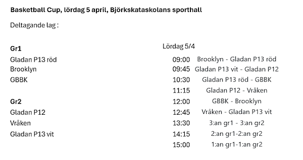 Nu på lördag spelar vi Basketball Cup i Björkskataskolans sporthall. Det är en prova-på-cup för lag som ska gå upp i seriespel (P13).