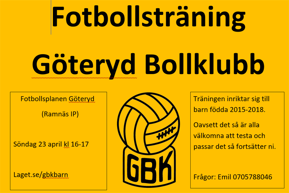 Hej Välkomna till vårsäsongen 2023. Bifogar inbjudan som bild, det kommer vara söndagar kl 16-17. Valborg, 30 april, är träningen flyttad till kl 11. Vi ämnar dela ut strumpor, vattenflaska och benskydd till nya spelare som blir medlemmar. Vi har även köpt in en träningstshirt med emblem att ge våra barn som är medlemmar, hoppas de passar. Vad som är extra kul i år är att vi även köpt in ett matchställ, vi hoppas ju kunna delta på någon cup även i sommar. På planen står det två stycken omonterade femmannamål som ska användas till träningen. Det kan bli en väldigt kul säsong även i år! Under dokument hittar ni mer information om medlemsskap. 2023 är det 200 kr/barn, swisha gärna till 123 371 97 05 och uppge namn på de som blir medlemmar. Mot nya gulsvarta höjder! Emil, Martin, Alexandra, Niclas