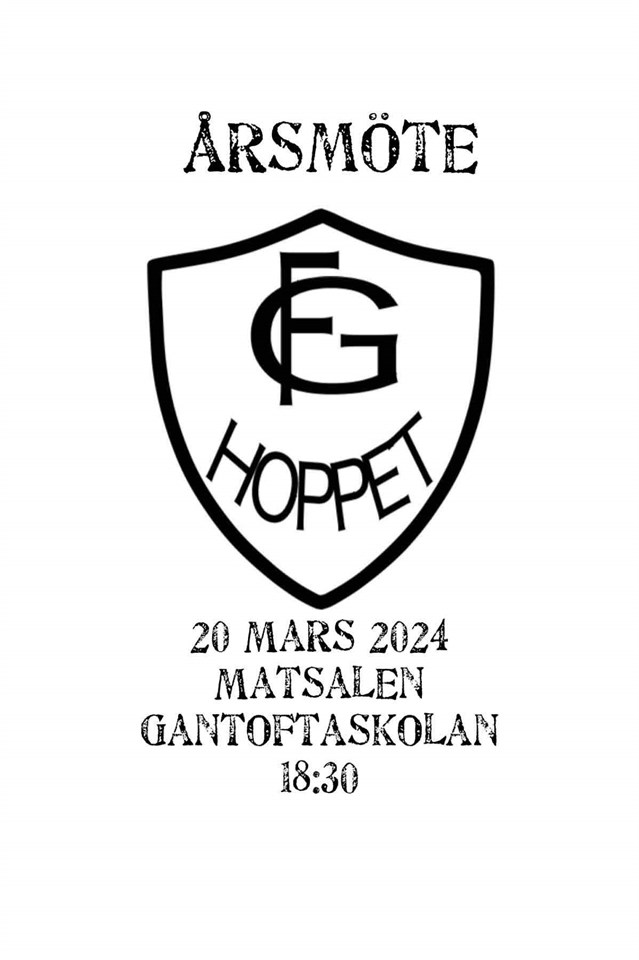 Varmt välkomna till årsmöte med GF Hoppet! Vi samlas i matsalen på gantofta skola 18:30 den 20 mars 2024. På agendan: - Stadgeändringar - vanliga årsmöteshandlingar Övriga motioner måste lämnas till styrelsen senast den 28 februari. - styrelsen