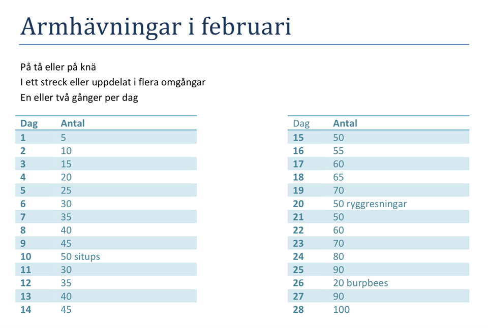 Månadens utmaning är just vad det låter – en utmaning som du tar dig an så mycket som du vill och har lust med – så är det ju med träning. Gemensamt för alla månandes utmaning är att det kommer att göra dig starkare eller mer uthållig eller mer hållfast eller alltihopa. Utmaningen är utmanande men ska även fungera i din vardag, varje dag. Den tar alltså inte lång tid, eller kräver någon speciell utrustning eller plats. Februari månads utmaning är ARMHÄVNINGAR. Vi börjar på 5 stycken och vi slutar sista februari med 100 stycken. På bilden ser ni hur många armhävningar (eller något annat om det är vilodag från armhävningar) som dagens utmaning innebär. Armhävningarna gör du på knäna eller på tårna, i ett svep eller uppdelat på flera gånger och du kan även bestämma dig för om du vill gå in i dubbel utmaning. Dubbla antalet. Så hur du vill ha din utmaning väljer du – och självklart kan du byta mitt i. Lycka till! //Patrizia