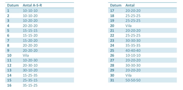 Efter en månad av armhävningar softar vi ner på armhävningar och tar oss an hela core-paketet i en tre-stegsraket. En stark mage/rygg (core) gör dig stark i hela kroppen och du kan stå emot och ge tacklingar och bidrar till att hålla dig skadefri. You go girls! Ni är Starka, Snabba, Spänstiga /FystränarPatrizia Varje dag görs antalet armhävningar (A), situps (S) och rygglyft (R) som anges. Armhävningarna görs på fötterna (eller knäna). Situps kan bytas mot anna valfri svinjobbig magövning som benlyft, fällkniven eller brutalbänk. Rygglyften görs med händerna på rumpan,bakom nacken eller framför huvudet. Ex A10-S20-R10 betyder 10 armhävningar, 20 situps och 10 rygglyft