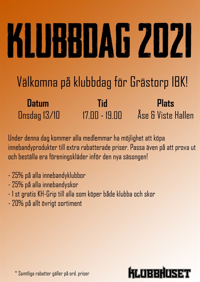 Klubbhuset kommer och säljer våra profilprodukter och annan innebandyutrustning. Onsdag 13 oktober 2021 Klockan 17.00 - 19.00 i Åse Visteha,,en uppe vid kafeterian. Under denna tid har alla medlemmar möjlighet att beställa profilkläder och köpa innebandyprodukter till extra rabatt 25% på innebanbdyklubbor och innebandyskor. Vid köp av både skor och klubba följer en grepplinda, KH-grip, med 20% på övrigt sortiment. Passa på att prova ut rätt storlek och handla till en slant billigare.