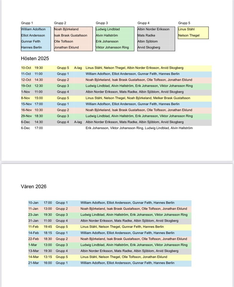 Hej! Jag har nu, så rättvist jag kan, gjort ett bemanningsschema för hösten 2025 och våren 2026. Jag har delat in aktiva spelare i fyra och en halv grupp. Den halva gruppen består av två fasta och sen fylls det på från de andra grupperna. Nu på fredag är första passet som ska bemannas då det är A-lagsmatch. Kan man inte ta sitt pass får man byta med nån annan eller köpa in en ersättare. Schemat kommer att ligga under Dokument, men bifogas även som bild i denna nyhet.