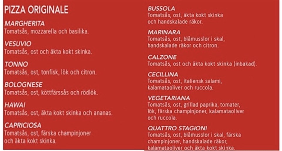 På bilden ovan ser ni vilka pizzor man kan välja på. Det finns också att välja på vanlig barnhamburgare med pommes 90gr. (Det är 2x45gr kött på den)