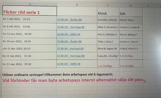 Hej! Då är säsongen igång för våra rosa stjärnor och vi ser fram emot många härliga matcher i både röd serie 1 och JAS. Nedan finner ni arbetsschema för F-röd serie 1, samtliga spelare (vårdnadshavare) har blivit tilldelade 1 pass var men vi behöver ytterligare några frivilliga som bemannar både kiosk och sek i slutet av säsongen. Utöver ordinarie seriespel tillkommer även arbetspass vid A-lagsmatch. JAS (Juniorallsvenskan) bjuder på 8 hemmamatcher, arbetspass bemannas enligt "frivillighetsprincipen" beroende på vilka spelare som blir kallade till varje match, viktigt är att vi alla hjälps åt och ser till att detta flyter. På söndag 2 oktober bemannar jag och Marita kiosken, vi behöver dock 2 st, till Sek. ............................................................................................................... Bemanning kiosk/sek Flickor röd serie 1 lö 1 okt 15:15 GS 86 AIF - Åmåls IBK GB hall, EJ kiosk Sek:Elina P, Alva J lör 8 okt 11:00 GS 86 AIF - Hertzöga BK Kiosk: Ebba O,Amanda G Sek: Evelina L, Emelie N fre 11 nov 19:30 GS 86 AIF - Säffle SK Kiosk: Alva G,Matilda A Sek: Alva H,Wilma P lör 26 nov 10:45 GS 86 AIF - Åmåls IBK Kiosk:Tilda J,Stina C Sek: Evelina C,Thea H sö 11 dec 16:15 GS 86 AIF - Karlstad IBF Kiosk:Moa M,Agnes W Sek: Frida K,Klara K G lör 11 feb 11:30 GS 86 AIF - Hertzöga BK Kiosk:Caisa W, + frivillig? Sek: 2 st.frivilliga? fre 17 mar 19:30 GS 86 AIF - Säffle SK Kiosk:2 st. frivilliga? Sek:2 st. frivilliga? Vid förhinder får man byta arbetspass internt alternativt sälja sitt pass Kioskrutiner enligt dokument från säsong 2022/2023 Enbart swish som gäller nu. Ha det gött! Mvh. Maria (Matildas mamma)
