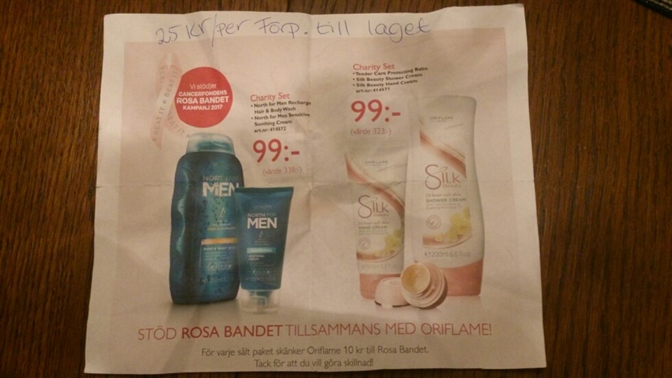 Hej! På eget initiativ har vi dragit igång försäljning av Oriflame herr/dam charity set. Detta är helt frivilligt men vi är tacksamma om många kan delta. Maritha (Amanda Gustafssons mamma) håller i beställningarna som senast ska vara inne 8 november, ring eller messa er beställning; 070-6403052 Försäljningen stöttar cancerforskning/rosa bandet. Herr set innehåller 2 produkter, dam set 3 produkter, se bifogad bild. Ordinarie pris är ca.300:- uppåt/set men vi erbjuder till priset av 99:-, då 10:- går till cancerfonden och 25:- direkt till vår lagkassa. Säljer vi på bra finns chans till efterbeställning så kör så det ryker :)