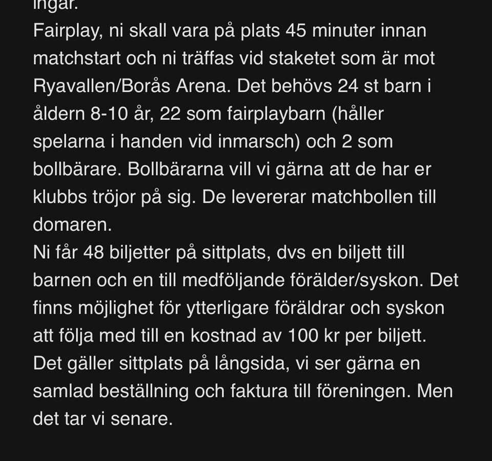 God kväll. Vi har fått chansen att gå in med spelarna på matchen Elfsborg - Djurgården. För spelarna gäller det att gå sida vid sida med spelarna under inmarschen. Som tack för detta får barnen + en vuxen en biljett och möjlighet att se matchen live på Borås Arena. Vill man finns det möjlighet att köpa till ytterligare biljetter för 100kr/st på långsida . Se bifogad bild. Kruxet är att vi har endast 11 platser (vi ”hjälper” P2013) så först till kvarn. Kommer skicka ut en separat inbjudan så svara gärna omgående på den om ni vill gå, första 11 har en plats /Ledarna GSK/MIF F2014 13 mar 2022 1kommentar