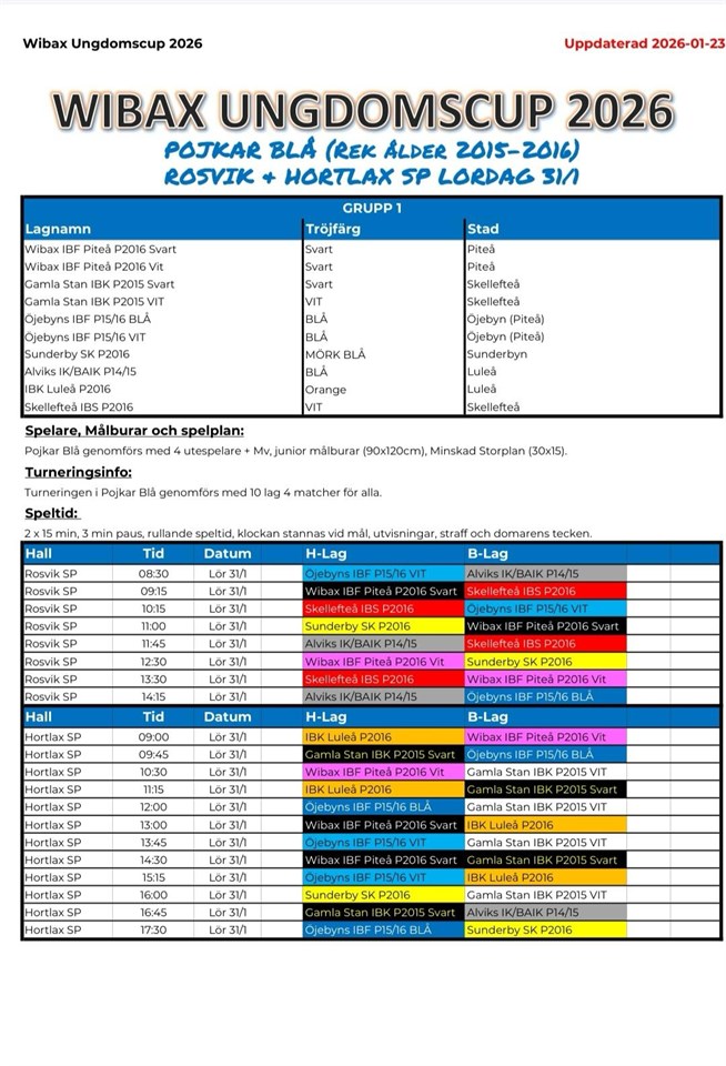 P-15 kommer att spela cup på lördag 31 januari och vara uppdelade på två lag för att killarna ska få så mycket speltid som möjligt. Alla matcher spelas i Hortlax Sporthall. Vi ser till att fylla alla bilar med spelare och träna Samling 30 min innan samtliga matcher. GRUPP 1 = Lag SVART (Philip G, Love, Hugo, Alex, Tyr, Edvin, John, Isaac, Mio. Tränare: Simon, Johan, Oscar och Nisse) GRUPP 2 = Lag VIT (Loke, Harry, Filip, Holger, Valter, Alvin, Oscar, David, Hjalmar. Tränare: Peter, Moa, Petter) SPELSCHEMA: LAG SVART Kl. 09:45 - Gamla Stan P-15 Svart - Öjebyns IBF P15/16 Blå Kl. 11:15 - IBK Luleå 2016 - Gamla Stan P-15 Svart Kl. 14:30 - Wibax IBF Piteå P2016 Svart - Gamla Stan P-15 Svart Kl. 16:45 - Gamla Stan P-15 Svart - Alviks IK/BAIK P14/15 LAG VIT Kl. 10:30 - Wibax IBF Piteå P2016 Vit - Gamla Stan IBK P2015 Vit Kl. 12:00 - Öjebyns IBF P15/16 Blå - Gamla Stan IBK P2015 Vit Kl. 13: 45 - Öjebyns IBF P15/16 Vit - Gamla Stan IBK P2015 Vit Kl. 16:00 - Sunderby SK P2016 - Gamla Stan IBK P2015 Vit Under matcherna på cupen kan spelare lånas mellan lagen, men blir det akuellt löser tränarna det på plats. Ta med: Klubba Matchtröja Svarta matchstrumpor Svarta shorts Vattenflaska Packa med mellis/enklare lunch så vi kan äta tillsammans i sporthallen. Gamla Stan står för cupavgiften och spelarna betalar själva för mat & dryck. Vi fyller bilarna så ingen åker ensam - skriv i kommentarfältet om någon behöver plats i en bil så hjälps vi åt att lösa det. En kallelse till cupdagen har skickats ut och är nu uppdaterad med spelschemat. Här hittar ni all info om cupen: https://www.svenskalag.se/wibaxibf/sida/124565/wibax-ungdomcup-2026 //Ledare & Tränare