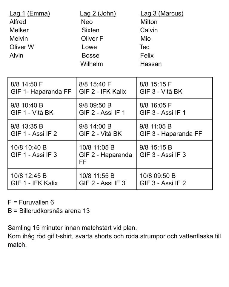 Det närmar sig BD-open och en helg fylld med fotboll och glädje! I bilden ovan ser ni lagindelning och spelschema. Hör av er till någon av oss ledare vid frågor eller funderingar. Här kommer lite övrig information kring helgen: Invigning: På fredag kl 19.15 är det invigning på Furuvallen för samtliga lag. Vi samlas vid Centrumskolan kl 19.00 (vid ingången till Furuvallen). Alla spelare och ledare ska ha GIFtröja (matchtröja) eller GIFdress, vanliga skor. En godispåse samt en rolig upplevelse utlovas alla spelare. Disco: På lördag är det ett gratis disco för spelare i BD open (visa armbandet vid entrén). Detta är ingen lagaktivitet med ledare, varje familj ansvarar för om ens barn ska delta på discot eller inte. Prata gärna ihop er med andra, då förmodligen flera vill gå och då kan gå tillsammans. (Tidigare har det varit ok att en förälder följer med in om så önskas, kontakta någon via BD-open’s hemsida om ni har frågor) Ålder: 2015-2020 Var: Kalix Folkets hus När: Lördag 18.30-19.30 (därefter har de äldre barnen disco) Kioskförsäljning (Kontant/Swish) Bad: Under helgen är det gratis bad på Strandängsbadet. Kom gärna och heja på de andra GIF-lagen när ni har ledig tid, och glöm inte supportertröjorna! P-2018 1 aug 2025 2kommentarer
