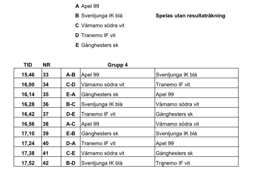 Vi samlas på Öckerö klockan 09:00 på söndag matchtider är följande Lag 1 Hugo Leo Scott Melker Melvin Justin 09:45 11:15 12:45 14:15 16:00 Lag 2 Jon Liam William Olle Attila Michael 10:15 11:45 13:15 14:45 16:15 Vi kommer behöva dubbla så det kommer bli mycket speltid GSK/MIF P2012 2 feb 2024 2kommentarer