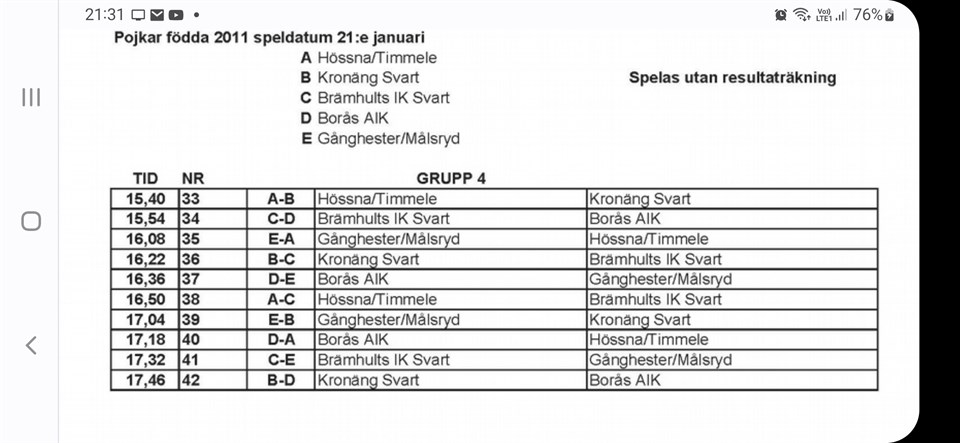Som vi kom överens om på föräldramötet skulle vi fortsätta med 1 extra förälder vid träningar enligt detta schema här nedan för de första 6 veckorna. Har man förhinder på sin tilldelade tid byter man själv med någon annan. 30/1 Måndag Samuel 2/2 Torsdag Alfred 6/2 Måndag Arvid (gånghester) 9/2 Torsdag Teo 13/2 Måndag Noel 16/2 Torsdag Ville J 20/2 Måndag Niilo 23/2 Torsdag Holger 27/2 Måndag Arvid (Målsryd) 2/3 Torsdag Jens 6/3 Måndag 9/3 Torsdag Benjamin GSK/MIF P2012 29 jan 2023 0kommentarer
