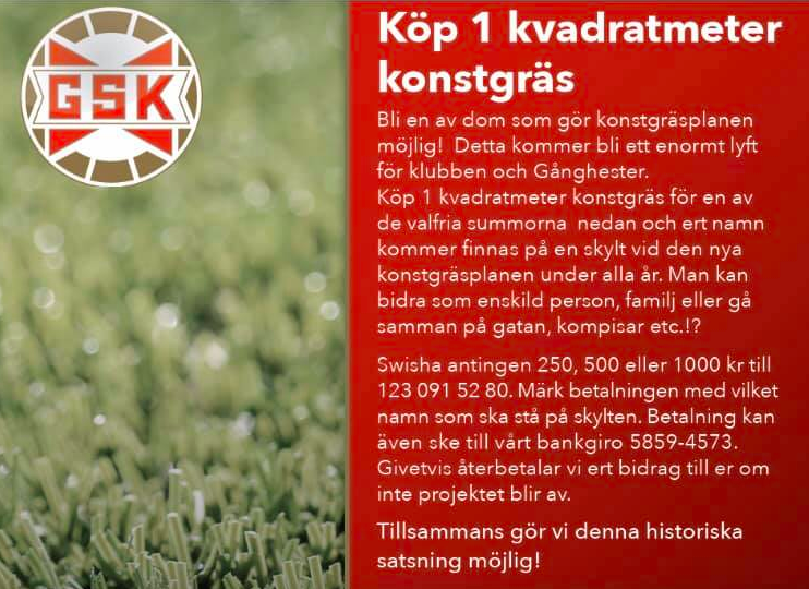 På tisdag lämnas listan på alla namn som hjälpt oss förverkliga konstgräsplanen in för tryck. Vill man finnas med på denna historiska skylt så har man till på måndag kväll på sig att swisha in sitt bidrag! swisha 250, 500 eller 1000 kr till 123 091 52 80. Märk betalningen med vilket namn det ska stå på tavlan vid konstgräsplanen!
