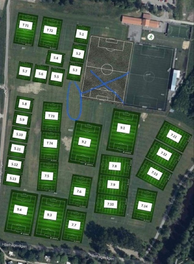 Samling inför första matchen respektive dag sker 45 min innan första matchstart vid aktuell plan (bifogar en karta över planerna på Rosta Gärde). Samling inför den andra matchen sker 20 min innan matchstart vid aktuell plan.