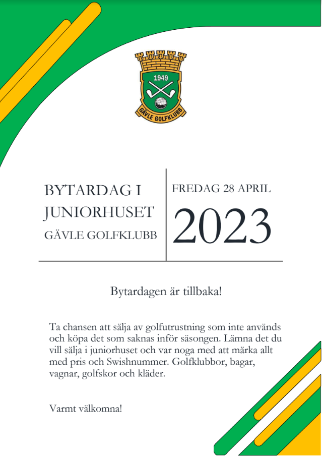 Bytesdagen är tillbaka! Ta chansen att sälja av golfutrustning som inte används och köpa det som saknas inför säsongen. Lämna det du vill sälja i juniorhuset och var noga med att märka allt med pris och swishnummer. Golfklubbor, bagar, vagnar, golfskor och kläder är välkommet! Varmt välkomna! Datum: Fredag 28/4 - från kl 09.00. ps. du kan behöva synka med shopen eller ledare för att få ställa in prylar om du vill lämna i förväg. Vi jobbar även på att hitta en träningstid/dag och återkommer så snart som möjligt. F14-16 23 apr 2023 0kommentarer