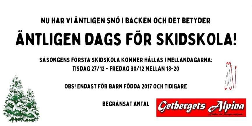 Nu kan vi äntligen meddela att säsongens första skidskola kommer hållas under mellandagarna!🎿🎄 Det är som vanligt begränsat antal platser och nytt för i år är att anmälan sker genom att fylla i ett formulär. Observera att er plats i skidskolan först är garanterad när ni får ett bekräftelse sms, alltså är det INTE säkert att ni får en plats bara för att ni fyllt i formuläret. De som inte får en plats hamnar på reservlistan och självklart meddelar jag även detta! Länken till formuläret kommer läggas ut här på facebook imorgon fredag kl 12.00 och då är det först till kvarn som gäller! Att tänka på: - Ett barn per formulär - Barnet är född 2017 eller tidigare - Barnet är nybörjare, dvs kan inte åka själv i backen eller i liften - Kostnad 600kr/barn - Betalning sker med jämna kontanter på plats på Getberget vid första tillfället Får ni ingen plats i denna skidskola är det bara att hålla utkik, tanken är att ha fler skidskolor denna säsong om intresset finns!? Har ni frågor eller funderingar, tveka inte att skicka ett meddelande till oss på facebook alternativt skicka sms till Olivia Göransson, 070-3803747 Getbergets Alpina IF 22 dec 2022 0kommentarer