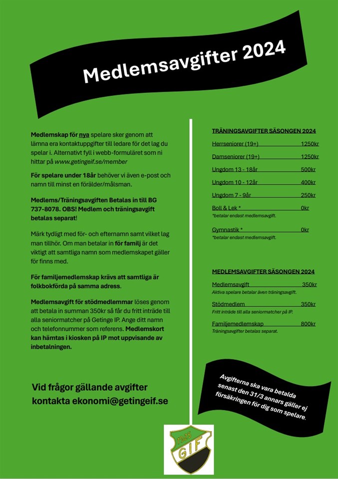 Nu är det dags att betala medlemsavgift för samtliga spelare för fotbollsåret 2024. Medlems- och träningsavgift betalas in till Bankgiro 737-8078. Tänk på att Medlemsavgift och träningsavgift betalas separat. Märk tydligt med för- och efternamn och vårt lagnamn P2015. Är ni fler aktiva i familjen och betalar Familjemedlemskap är det viktigt att samtliga namn står med. Se bifogad bild för vilka avgifter som gäller detta året eller läs på medlemssidan. VIKTIGT! Betalningen ska vara gjord senast den 31 mars annars gäller inte försäkringarna för våra spelare. Har du frågor kontakta ekonomi@getingeif.se Det går att ansöka om stöd för avgifter hos Stifelsen Majblomman om man har behov av det. Läs mer på https://majblomman.se/sok-stod/sok-har/ F 2015-2016 10 mar 2024 0kommentarer