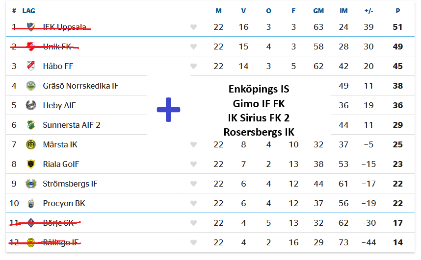 Nu KAN ju lag dra sig ur seriespel, åka ur på ekonomiska grunder eller få flyttas upp då det händer saker högre upp plötsligt. Men OM alla lag vill och får spela på så borde serien "Div 4 Uppland Herr" innehålla dessa tolv lag. Så håll till godo - en första lilla spaning på våra motståndare 2026 och in i en tuff utmaning! OBS! Detta är inget "kamikazetips" utan vi radar upp lagen efter placeringen 2025 och nykomlingarna därefter helt enkelt! Håbo FF Trean i serien som tappade sin plats i just trean i slutet av den sista kvalmatchen. Har seriens överlägsna skyttekung i Lucas Madsen (23 mål på 22 matcher, 7 mål före tvåan!) och går garanterat för revansch och seriesegern 2026! Lirar sina matcher på Futurum konstgräs i Bålsta. Gräsö/Norrskedika IF En fjärdeplats som nykomling är riktigt starkt och med två av de tre ovanför upp i trean så lär GNIF fortsätta satsa stenhårt på sitt sätt för att ta klivet upp nästa säsong. Stora favoriter 2026 givetvis och ett lag som, sett till besöksfrekvensen på vår Min Fotboll-sida, längtat efter oss hela säsongen! Nu är vi tillbaka och två välbesökta derbyn åter att vänta! Ett gräslag med en fin matta om vi slipper få dem alltför tidigt i spelschemat! Heby AIF En femteplats 2025 och en kvalplats 2024. Ett lag som kommer vara kvar i toppen 2026 säkerligen. Vi stod upp bra mot dem i Upplandscupen, och med ordinarie lag en match vi ska vinna. Men sen kanske respektive lag har helt andra lag när vi möts igen i vår så vi ska nog inte lägga för mycket vikt vid höstens möte. Nytt år och nya förutsättningar- Tegelvallens konstgräs är hemmaarenan! Sunnersta AIF 2 Ett stabilt lag som liftar med i sitt representationslags framgångar! Med A-laget i toppen av tvåan är det klart det finns massor av talang och kunnande även i andralaget. Ett tufft lag att möta alla dagar i veckan! Sunnersta IP är det som gäller för bortaresan - tidigare en väldigt fin gräsplan - men visst blev även den utbytt mot plast under året? Märsta IK Apropå tuffa lag - är detta seriens tuffaste lag? 7 röda och en jäkla massa gula ger dem ett Fair Play-snitt på 4,05 vilket man är i absolut Upplandstopp med! (att jämföra med våra egna "mesiga" 0,95). En region med många duktiga fotbollsspelare dock och får de snurr på helheten kan de slå många lag i serien! Ännu ett konstgräslag med spel på Midgårdsvallens konstgräs! Riala GoIF Ett lag vi spelat tighta träningsmatcher med några gånger på sistone. Var laget som gick upp som "bättre tvåa" än oss 2023 och har hållit sig kvar sedan dess. En av seriens längre bortaresor men en trevlig arena med naturgräs på Lundbyvallen! Strömsbergs IF Ytterligare ett lag vi gärna träningsmatchat mot senaste åren och haft tighta matcher emot. Var med i nedflyttningsstriden in i det sista men efter 7 poäng under sista fyra matcherna såg man till att hålla Börje, Bälinge - och till slut även Procyon efter sig. Trevlig anläggning med fin gräsmatta på Hedens IP! Procyon BK Lirade i div 3 så sent som 2024, var länge ett lag i seriens lägsta skikt men spelade upp sig under 2025 för att dippa igen på slutet och hamna precis ovanför nedflyttningsstrecket. Stenhagens stolthet kan bli både fågel och fisk beroende på vilket lag de ställer på benen, seriens mest svårbedömda lag och Stenhagens konstgräsmatta är det som gäller som hemmaarena här! Enköpings IS Vinnare av div 5 Södra. Släppte som oss in minst mål i sin serie och verkar vara en defensivt stark motståndare! En bortamatch man kan se fram emot då de verkar spela på Enavallens A-plan - vilket ju absolut måste vara seriens bästa gräsmatta! Kul! Rosersbergs IK Tvåa i div 5 Södra - med seriens två bästa målskyttar i Lukas Makdesi och Joakim Brolund. Mest mål gjorda och bäst målskillnad - en offensivt vass nykomling? ÄNNU ett konstgräslag med hemmaplan på Råbergsvallens konstgräs. IK Sirius FK 2 Tvåa i div 5 Norra och det enda lag i vår serie vi inte lyckades vinna emot. Lär fortsätta ånga på i rekryteringen - både från Sirius egna led och utifrån. Ett redan talangfullt och träningsvilligt lag som lär bli bättre - en av seriens stora favoriter givetvis! Gimo IF FK Vi har någon återvändare på väg hemåt, men annars rycks det såklart i en viss skyttekung och i bakre leden så satsar mittbacksgeneral Fleming på domarkarriären och tvingas då kapa banden till Idrottsgården. Behåller vi truppen intakt ska vi kunna vara ett lag på övre halvan, om inte har föreningen ett hårt jobb framför sig. Med steget upp hoppas vi nu kunna jobba lite mer långsiktigt och utveckla ett i grunden redan starkt lag - som dock måste både breddas och spetsas för att klara utmaningen som väntar! Sammanfattningsvis Många nykomlingar kan man ju tänka sänker kvaliteten på en serie - men känslan är att det är fyra starka nykomlingar och ska man klara sig kvar är det nog ett par -tre av div 4-lagen från 2025 man måste försöka hålla sig ovanför! Med så många Upplandslag i div 3 ökar såklart också risken att fler lag åker ur än under 2025 - vilket var ett maxat år för de uppländska lagen. Sett till arenor och underlag är det väl totalt sett ett steg bakåt från 2025 med betydligt fler konstgräslag och endast vi, Strömsberg, Riala, EIS och GNIF som gräslag - medan övriga sju lag lirar på konstgräs. Bara att hoppas att vi får bortamatcherna mot gräslagen när gräsplanerna är spelbara och inte alltför tidigt... Dessutom betydligt längre resor för både oss och våra supportrar - men såklart också ett kommunderby igen som motvikt. Så både plus och minus gällande alla dessa bitar. Det jämnar ut sig i slutändan! I ett i högsta grad killgissande oktober-tips så tippar vi att GNIF, Håbo och IK Sirius 2 tar hand om topp tre utifrån resurser nu och framåt och resultat 2025, medan vi, om vi gör en bra vinter både tränings