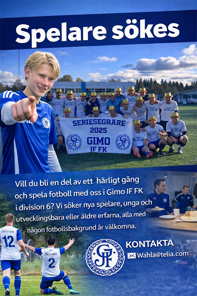 VI BEHÖVER BLI FLER! Flest spelare behöver vi runt vårt div 6-lag då det skulle betyda mest för helheten - men bredd och spets till vår A-trupp är såklart också välkommet och viktigt inför vår comeback i div 4! Med en träningsvillig A-trupp som fortsatt ta kliv och nu tar plats i div 4 2026 har vi upplevt att steget mellan representationslag och reservlag till viss del har har blivit större – i så väl träningsambitioner som färdigheter. Sportsligt som fysiskt. För att möta alla spelare på rätt nivå och för att skapa förutsättningar som gör det roligt för alla att spela och träna fotboll oavsett ambitionsnivå så skulle vi inför 2026 helst vilja skapa en bättre tränings- och matchmiljö för vårt andralag - genom att få in flera spelare som vill bredda vår trupp för att växa med och stärka vårt div 6-lag - och då också indirekt stärka vårt div 4-lag. ÄR DU DEN VI SÖKER? Kom och provträna något av dessa tillfällen om du är sugen att testa! Men hör av dig till kontaktperson nedan i god tid innan så att vi kan planera in dig i träningen och kan informera om träningsupplägget. Onsdag 21/1 21.00-22.00 Gimo Sporthall (Jogg/Löp utomhus 20.30) Onsdag 28/1 21.00-22.00 Gimo Sporthall (Jogg/Löp utomhus 20.30) Onsdag 4/2 21.00-22.00 Gimo Sporthall (Jogg/Löp utomhus 20.30) Onsdag 11/2 21.00-22.00 Gimo Sporthall (Jogg/Löp utomhus 20.30) Oavsett upplägg (om vi tränar tillsammans eller delar truppen) behöver vi helt enkelt bli fler för att få ihop vår matchmiljö i div 6 med en grund av spelare som tränar regelbundet. Sen om du vill träna en gång i veckan eller tre gånger i veckan är upp till din ambition. Lika om du jobbar skift och bara kan vara med varannan vecka. Alla behövs. OM det i slutändan skulle bli en delvis delad träningsmiljö så kommer det fortsatt vara möjligt för spelare i A-lagsverksamheten att spela matcher i div 6-miljön för att få viktig och bra matchträning. Det kommer då även fortsatt vara möjligt för spelare att med snabb utveckling eller ökade ambitioner få flytta upp i representationslaget (förutsatt att utrymme finns i den truppen). Dörrarna mellan verksamheterna är aldrig stängda och vi kommer jobba för att ha ett gott samarbete och god sammanhållning mellan representationslag och andralag. Just nu ser det ut att bli så att vi fortsätter jobba med en stor trupp där vi endast i själva träningen delar upp truppen. I individuell positionsträning, lagdelsträning eller matchförberedande kollektiv träning. Allt för att skapa bästa möjliga förutsättning för individuell och kollektiv utveckling - för bra prestationer och resultat. Allt hand i hand. Det vore fantastiskt kul att som förening kunna erbjuda en miljö som passar och lockar fler att spela fotboll längre, kunna ställa ett välmående andralag med en bredare trupp på benen, ett lag med lokal förankring, en kul tränings- och matchmiljö för dem som inte vill släppa fotbollen helt men heller inte har tid att satsa fullt ut – och en viktig tränings- och matchmiljö för de yngre spelarna som ska ta sina första steg in i seniorfotbollen - och parallellt med detta erbjuda en spetsigare träningsmiljö för de som kommit lite längre eller vill komma längre - dvs spelarna i och närmast vår div 4-trupp! Varmt välkommen att visa intresse genom att kontakta kontaktperson och delta i våra provträningar inomhus nu under januari-februari - vilket i första hand är onsdagskvällarna i sporthallen. Som nämnt - viktigt att du tar kontakt innan träning så vi vet hur många som tränar - samt kan säkerställa för dig som vill träna att träningen faktiskt går av stapeln som planerat och informera om ev förändringar. OBS! Kan du inte träna av fysiska skäl eller liknande nu under vintern men är intresserad av vår fotbollsmiljö 2026 så kan du givetvis höra av dig och anmäla intresse ändå - oavsett om det gäller div 4-laget eller div 6-laget! Andreas Wahlqvist, sportsligt ansvarig Gimo IF FK herr wahla@telia.com 073-623 88 26