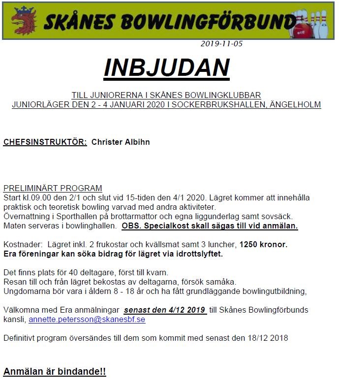 Hej. Här kommer en inbjudan till Ängelholms lägret. Jag skulle behöva svar från er senast den 14/11 så kan jag anmäla er. Mvh Magnus Ungdomsbowling 5 nov 2019 0kommentarer