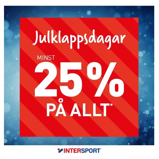 Missa inte julklappsdagar hos vår samarbetspartner Intersport 11–15 december. Passa på att handla sport och sportmode från välkända varumärken - just nu med minst 25% rabatt på allt. Ge bort sport i jul! Välkommen till din närmsta Intersportbutik eller intersport.se! * Erbjudandet gäller 11–15 december på ord.pris, dock ej på cykel, presentkort, elektronik, föreningskläder/teamkläder eller beställningsvaror.