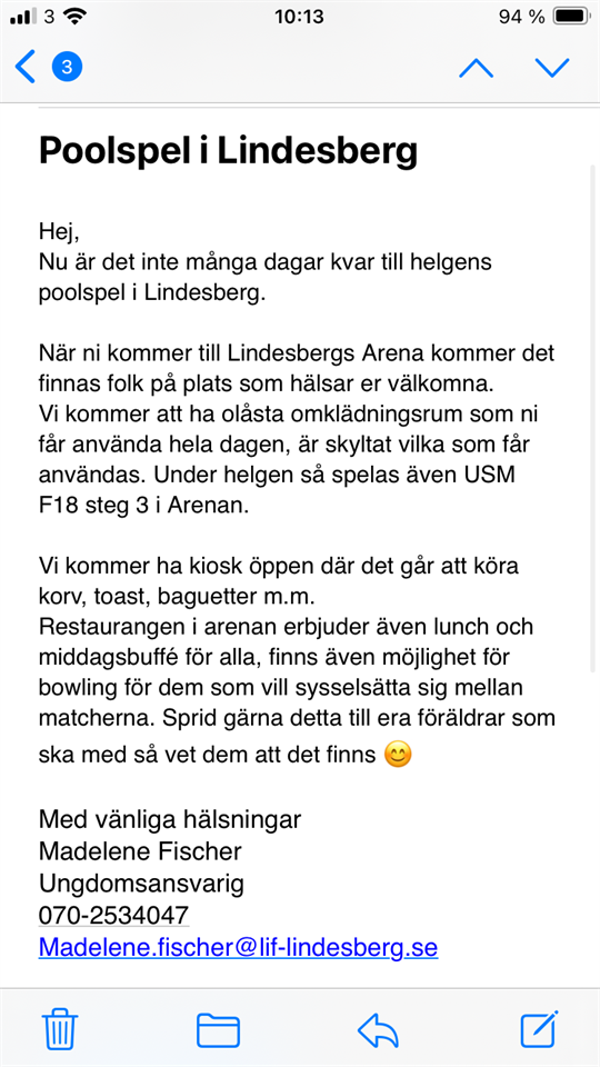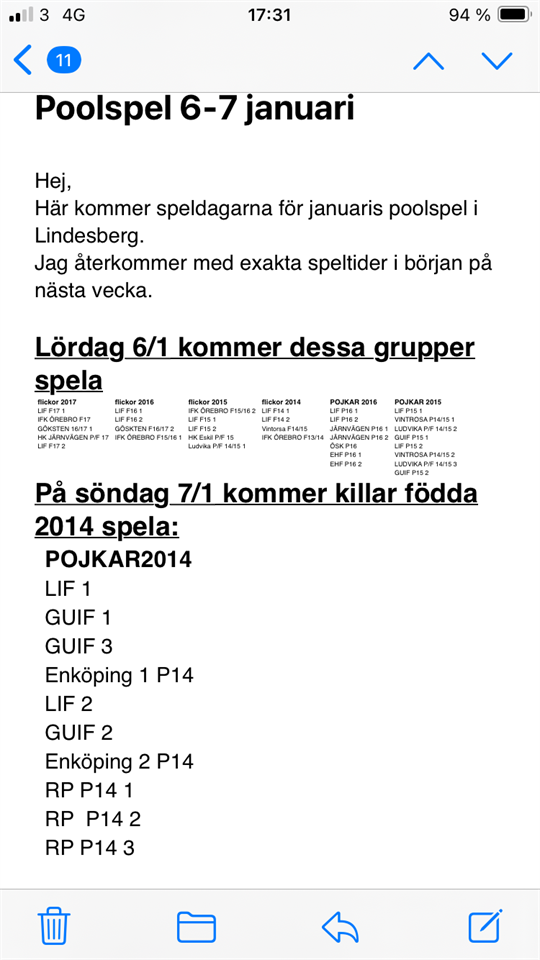 Nu börjar det närma sig lite buskul aktiviteter i Lindesberg Vi spelar alla matcherna lördagen den 6/1 i Lindesbergs Arena Nyborgsgatan 1, 711 34 Lindesberg Spelschema: Lag 2: Samling 8.45 i Lindesberg medtag egna shorts eller andra träningsbyxor, skor, strumpor och vattenflaska ev egen matsäck. Det finns kiosk med korv och toast. 9.30 Lif F16 1- Göksten 2 10.30 IFK Örebro F16 - Gökstens 2 12.00 Göksten 2 - HK Järnvägen F 15/16 1 Samtliga matcher spelas på plan 4. Spelare i lag 2 Stella N Thea Tilde Vera Anna Olivia Inez Ellen Lou Lag 1: Samling 12.45 i Lindesberg medtag egna shorts eller andra träningsbyxor, skor, strumpor och vattenflaska ev egen matsäck. Det finns kiosk med korv och toast 13.30 Göksten 1- HK Järnvägen P/F 17 15.00 Lif F17 2- Göksten 1 16.00 Göksten 1- Lif F17 1 Samtliga matcher spelas på plan 4 Spelare i lag 1 Stella T Izzy Vendela Ingrid Annabell Charlize Stina Vanessa Har skickat påminnelse till dem som inte svarat på kallelsen ännu plus till Ellen som inte fått någon kallelse innan eftersom den gick ut tidigare i höstas. Svara gärna så fort som möjligt. Vi behöver även hjälp av föräldrar som kan hjälpa till kring laget under dagen då jag (läs Tina) måste jobba. Vill även passa på att önska alla ett Gott Nytt År //Tina F-17 29 dec 2023 14kommentarer