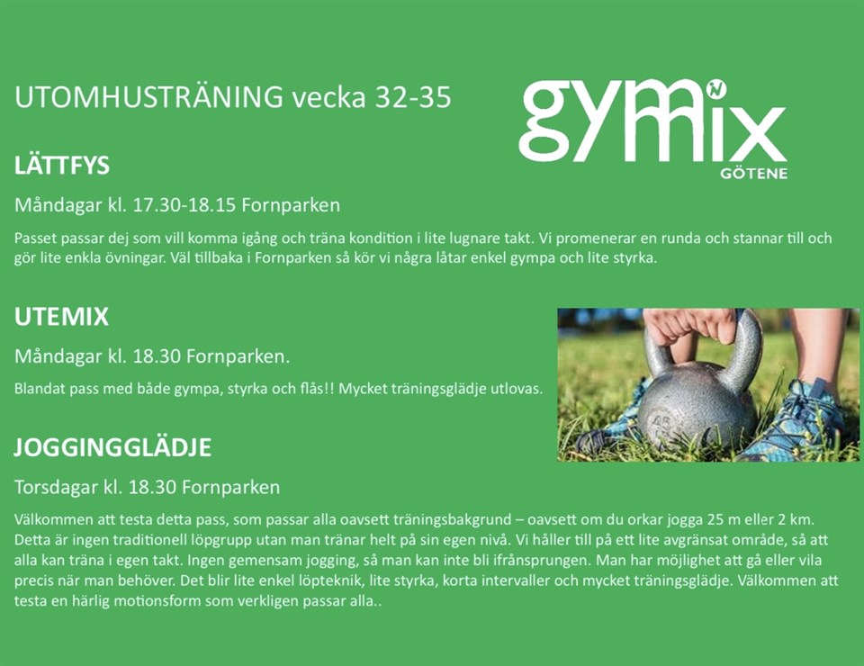 Nu kör vi gång utomhusträningen igen. Nya som gamla Gymmixare är välkomna! Götene Gymnastik o MF 25 jul 2024 0kommentarer