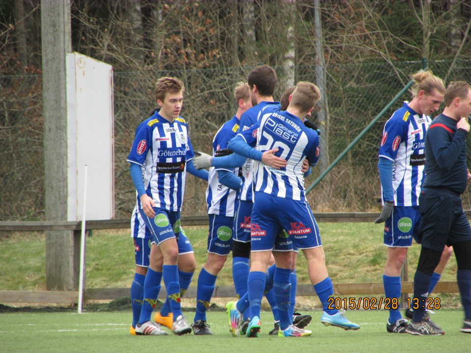 Med Alexander Andersson bortrest Oskar Stridh sjuk och Karl Svensson skadad så trodde man på förhand att det här kommer att bli en match som blir väldigt tuff att vinna men grabbarna visade från start var skåpet skulle stå för det hade inte ens gått en minut på matchuret då Christoffer Apell trycker in bollen i nätet till 1-0. Dom blåvita grabbarna fotsätter sen att spela en jättefin fotboll och i minut 7 så visade John Eriksson vilken glöd han har i vänsterfoten med ett kanonskott rätt upp i krysset. 2-0. Med ett bra bolltempo så fortsätter sen grabbarna att ordna chanser och i minut 17 så tunnlade Robin Johansson in bollen säkert bakom Ulrisehamns målvakt 3-0 och det gick vi till pausvila med. Andra halvleken hade inte riktigt lika bra kvalite som den första men ändå inte dåligt götene fortsatte att jobba på och i minut 60 så tryckte kapten Norismaa in bollen i nätet. Sen i minut 62 så fick Ulricehamn ett tröstmål 4-1 och det blev slutresultatet. Beröm då jo först Edvin Berntssson som för dagen fick spela mittback med Norismaa med full godkänt betyg sen Martin Holmberg som ägde mitten med sin styrka John Eriksson med sina kännsliga fötter sen är det en härlig inställning i hela laget bra jobbat grabbar.