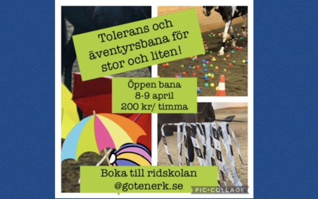Nyhet! Välkomna till Göteneryttarklubbs egen unika träningsbana där du både tränar tolerans och samtidigt får ett roligt äventyr med din häst! Varför inte boka ihop med kompisar Bokning 200 kr/person och timma. Max 4 pers /timme. Insläpp heltimme. Bokar du för grupp eller vill ha ridhuset för dig/er själva så är priset 500 kr. Götene RK 21 feb 2023 0kommentarer