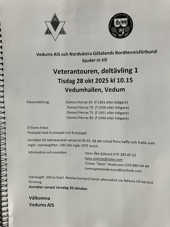 Veterantävling i Vedum 28 okt. Lista finns uppsatt i klubblokalen och tas ner på onsdag den 15 okt! Pensionärer 12 okt 2025 0kommentarer