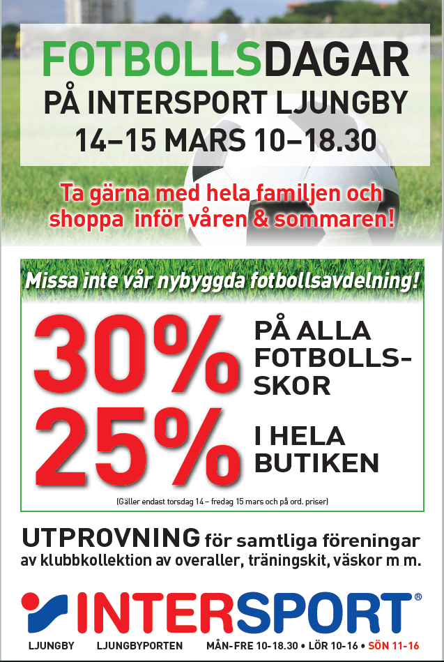 Missa inte FOTBOLLSDAGARNA hos vår sponsor INTERSPORT den 14-15 MARS. A-lag Herrar 7 mar 2019 0kommentarer