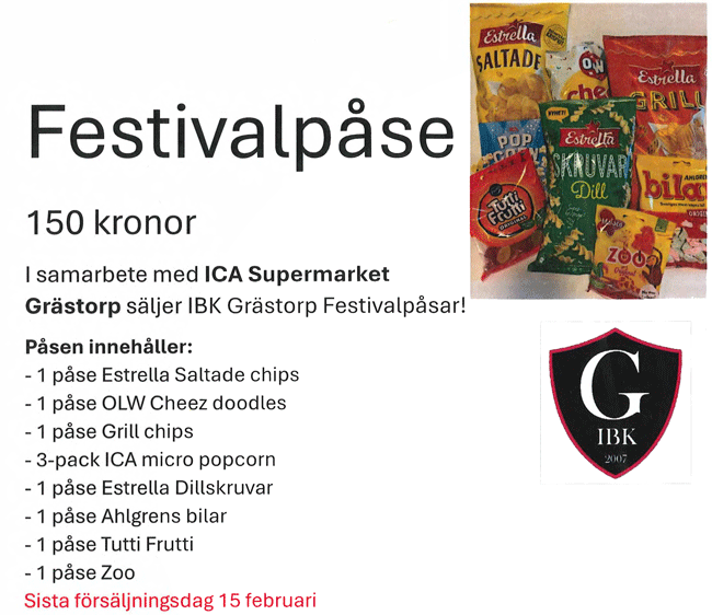 Våra spelare i alla lag säljer nu en helmysig kasse med goda GOTTISAR, lämpliga att ha när du tittar på Meldifestivalen. 150 kronor för en sprängfylld kasse med diverse snacks godis i samarbete med ICA Supermarket Grästorp. Sugen? Prata med och beställ från någon av spelarna i alla våra lag innan 15 februari