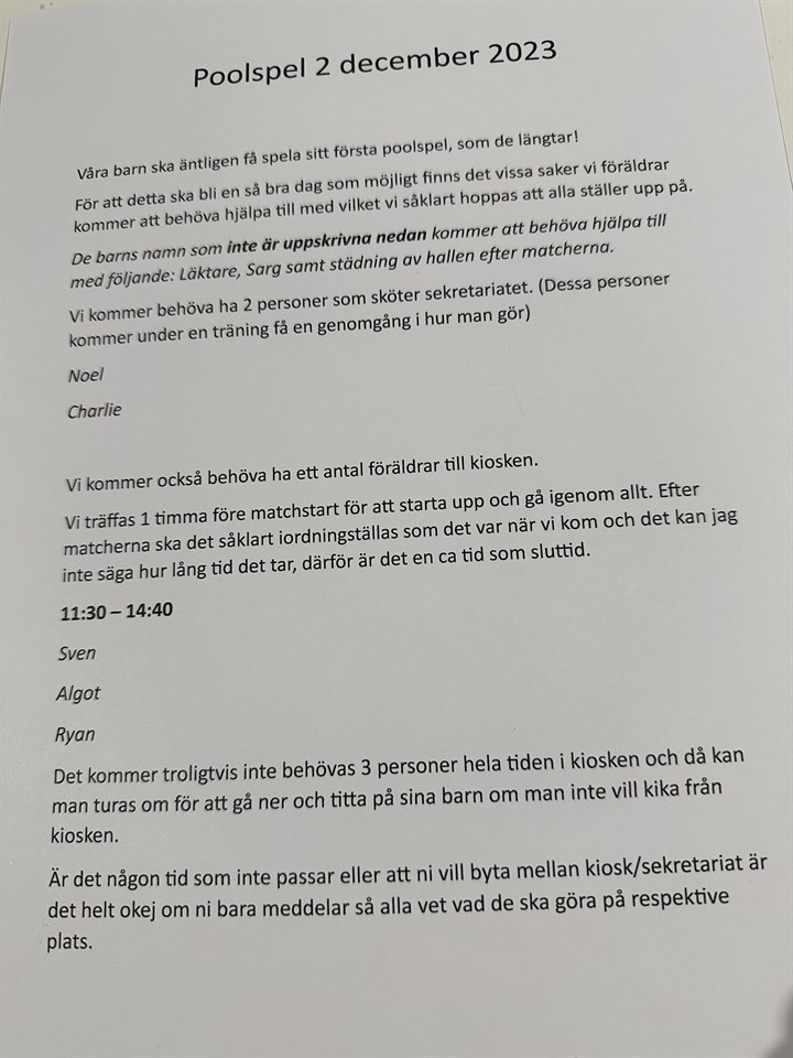Nu är det bara dagar kvar till poolspelet så här kommer information! I bilagorna ser ni informationen gällande tider mm. Samling kiosk: 11:30 Samling sekretariatet: 12:00 Samling spelare: 12:00