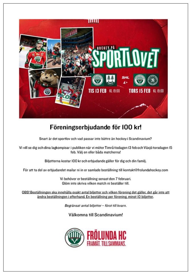 Föreningserbjudande för 100 kr! Biljetterna kostar 100 kr/st och erbjudande gäller för dig och din familj. Snart är det sportlov och vad passar inte bättre än hockey i Scandinavium? Timrå tisdagen 13 feb och Växjö torsdagen 15 feb. Välj en eller båda matcherna! Meddela mig hur många biljetterna ni vill ha senast 5 februari. Jag meddelar Joakim från vårt lag Team 11 och han lägger en beställning för hela klubben. Glöm inte meddela vilken match ni beställer till. Team 11 24 jan 2024 0kommentarer