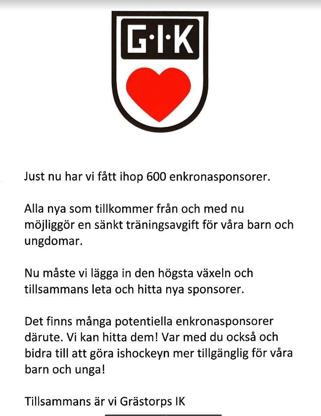 Just nu har vi fått ihop 600 enkronasponsorer. Alla extra sponsorer som tillommer möjliggör en sänkt träningsavgift för våra barn och ungdomar i Grästorps IK. Vi hjälps åt nu de sista dagarna att hitta sponsorer. Tack Team 11 31 jan 2024 0kommentarer