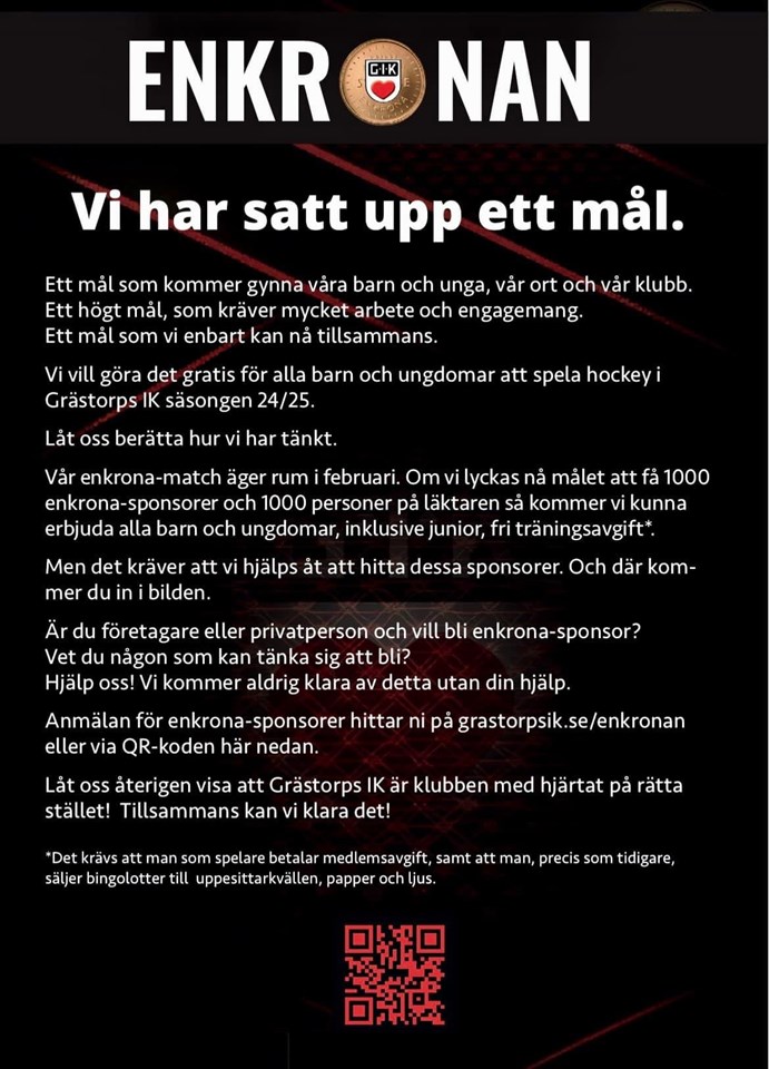 Vi har en utmaning i klubben att hitta sponsorer till vår 1-kronasmatch. Gå ihop på gatan, jobbet, i kompisgänget eller vad som helst. Ert stöd kommer hjälpa oss att kunna erbjuda gratis, eller iaf billigare, träningsavgift till barn & ungdomar i Grästorps IK. Busenkelt att anmäla sig på https://grastorpsik.se/enkronan/ eller hör av er så hjälper vi till Detta fixar vi tillsammans att sälja ett gäng 1-kronor i Team 11.