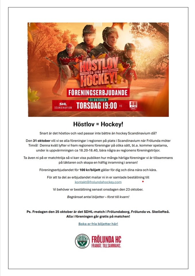 •Jourmatch idag på A-lagsmatchen bemannas av Mia, Rickard, Sofia och Martin. Angelica,Ulrica och Sofia bakar. •Hoppas komma med info i veckan om den fortsatta säsongen då vi måste få beslut från förbundet om våra dispenser för att få ihop barn till våra matcher. •Påminner om sista dagen imorgon 21 oktober för biljetter till Frölunda -Timrå torsdag 31 oktober •Fotografering19.35 på onsdag träning innan kl 18.45 •Behov av folk i varje lag som skall gå publiksvärdsutbildning. Återkommer kring detta då vi ju har Jourmatch idag så det blir först om några veckor. •Lovhockey tisdag och torsdag kl 11-12.15 för vår åldersgrupp ihop med 09 - 10 Team 11 20 okt 2024 0kommentarer