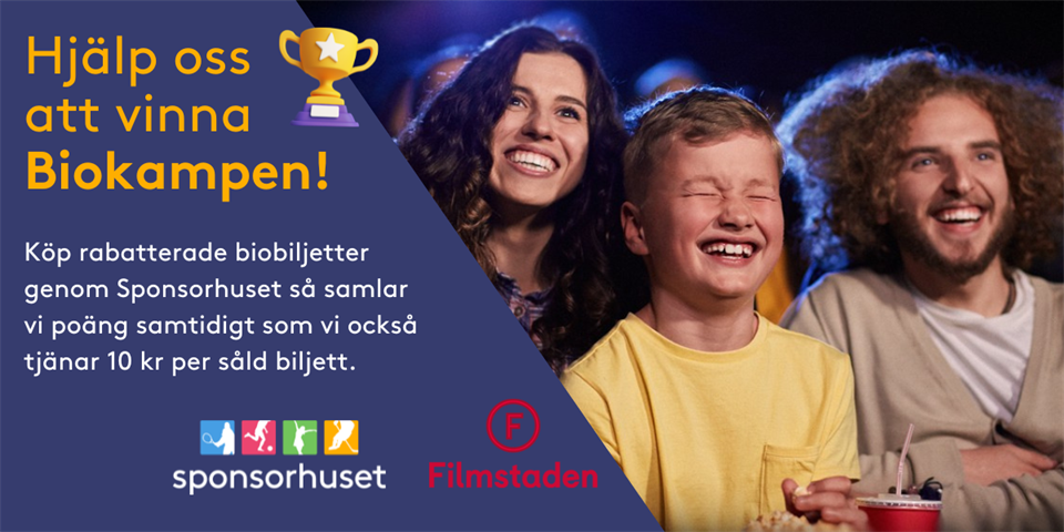 Sponsorhuset har tillsammans med Filmstaden dragit igång en rolig tävling där Grycksbo IF BK har chansen att vinna en privat biovisning för 50 personer, inklusive snacks! Du hjälper oss genom att köpa rabatterade biobiljetter i vår egen Bioshop. Nu är det dessutom den perfekta tiden att ladda upp med biobiljetter! Hösten är här och massor av spännande filmer har premiär. För varje biljett som säljs går 10 kr direkt till Grycksbo IF BK och vi får dessutom 10 poäng i tävlingen. Ju fler biljetter vi säljer, desto större chans att vi kammar hem vinsten! Tipsa gärna familj och vänner – varje köp räknas. Använd denna länk: