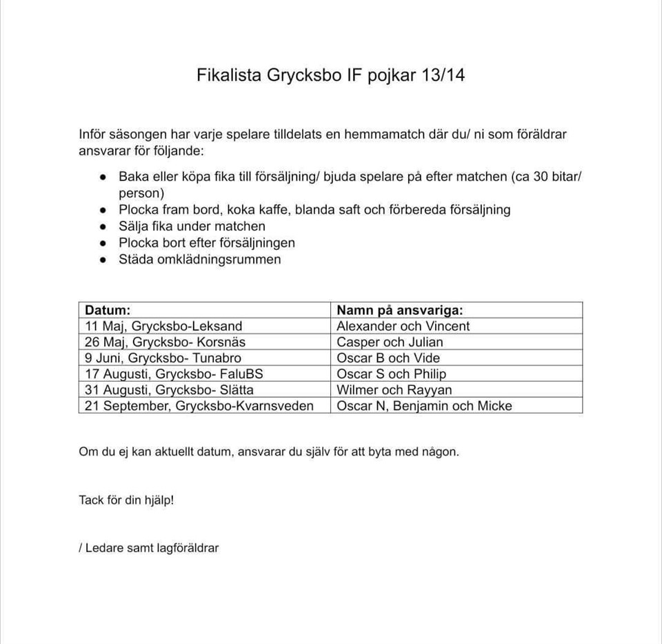 HĂ€r kommer listan för ansvar med fika och försĂ€ljning pĂ„ hemma matcherna. Se bifogad fil. Vi fĂ„r se hur det blir med första hemma matchen som spelas pĂ„ Dalavallen. Om det Ă€r lĂ€ttast att den hoppas över med fika. Återkommer om det. Om ni inte kan det datum ni fĂ„tt, ansvarar ni sjĂ€lva för att byta med nĂ„gon. U2013/2014 P 28 apr 2024 0kommentarer