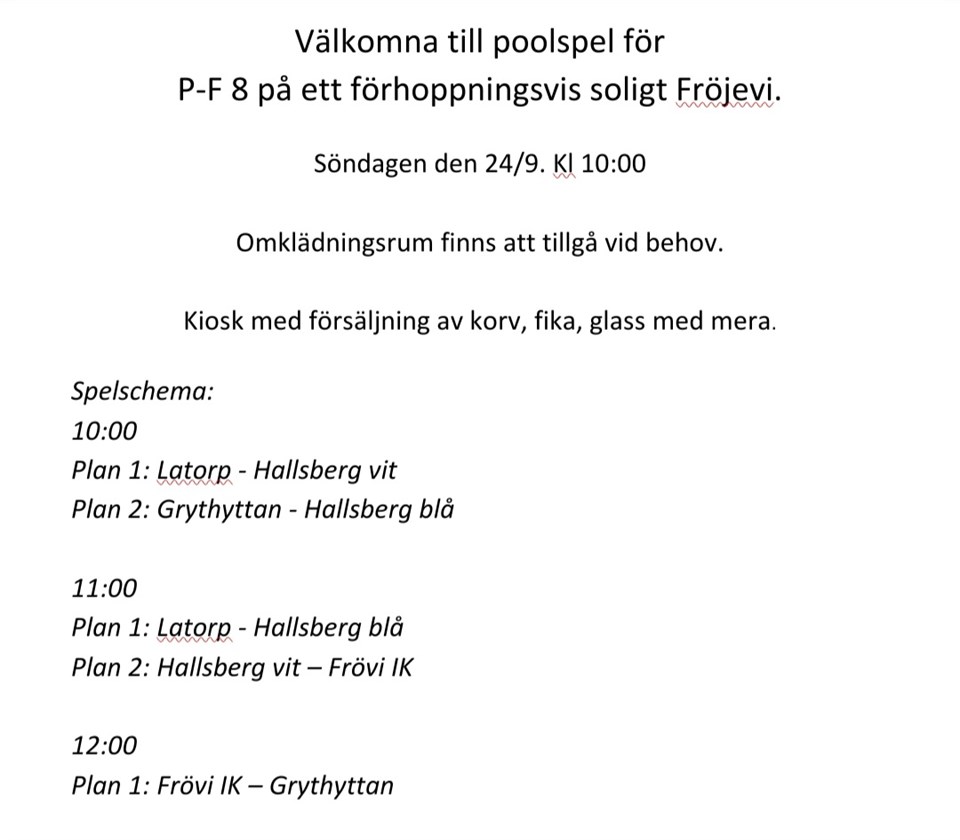 Kallelse till söndagens poolspel är skickad. Samling i Frövi (Fröjevi) kl 9.15 Första match 10.00. Har man matchställ hemma får man gärna komma ombytt till samling, annars tar Mattias med så att man kan byta om på plats. Om ni inte redan gjort det, meddela gärna här om någon spelare behöver skjuts. Spelschema finns i tidigare inlägg. P-15 18 sep 2023 0kommentarer
