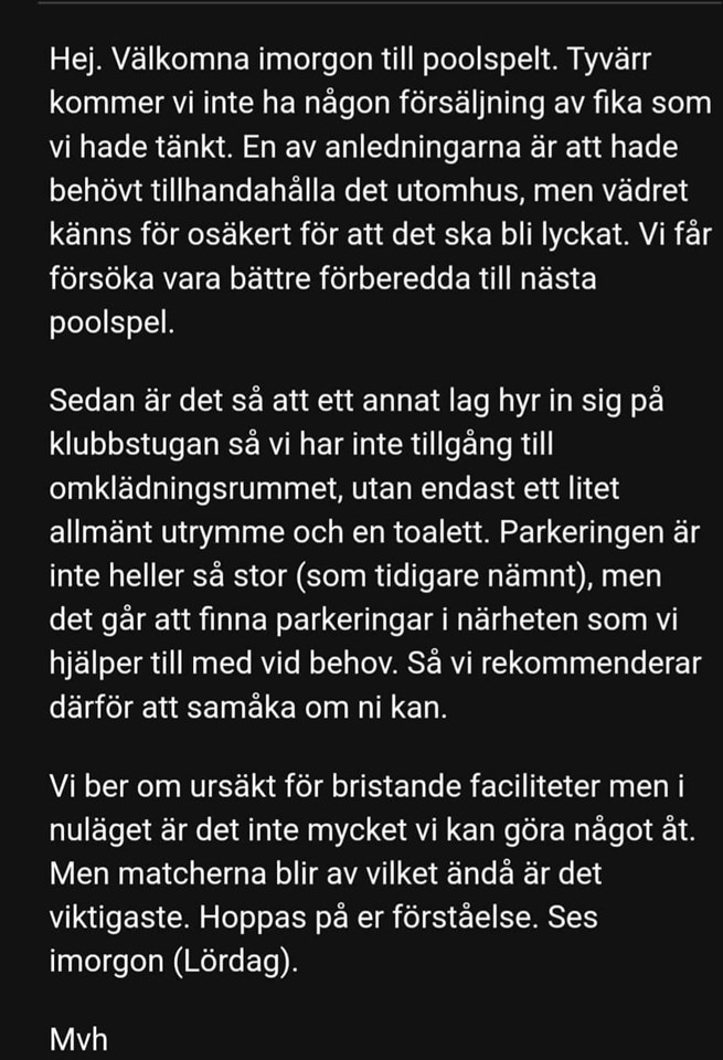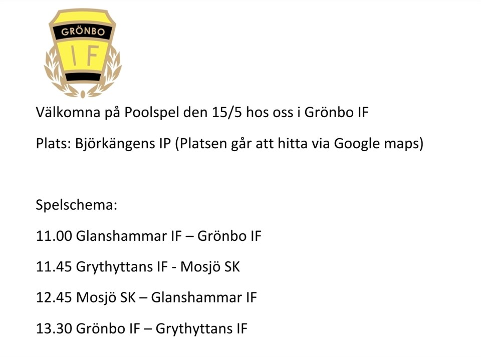 Hej på er! På söndag är det dags för säsongens första poolspel hos Grönbo IF (Björkängens IP) Vi kommer att spela 2st 5mot5 matcher (4spelare+målvakt) a 3x10 minuter. Eftersom att intresset verkar stort så kommer vi eventuellt att behöva dela upp barnen i två lag så att varje lag får spela en match vardera. Därför skulle vi önska att ni kommenterar i inlägget om ert barn vill/kan delta på söndag så att vi kan planera för eventuell lagindelning (beroende på hur många vi blir) Samling 11.00 i Grönbo Första matchen är 11.45 Andra matchen 12.30 Korv/hamburgare, fika mm finns att köpa. Glöm inte att ta med fotbollsskor, benskydd och vattenflaska. Har man egna gula eller svarta fotbollsstrumpor får man gärna ta med. P-15 11 maj 2022 16kommentarer