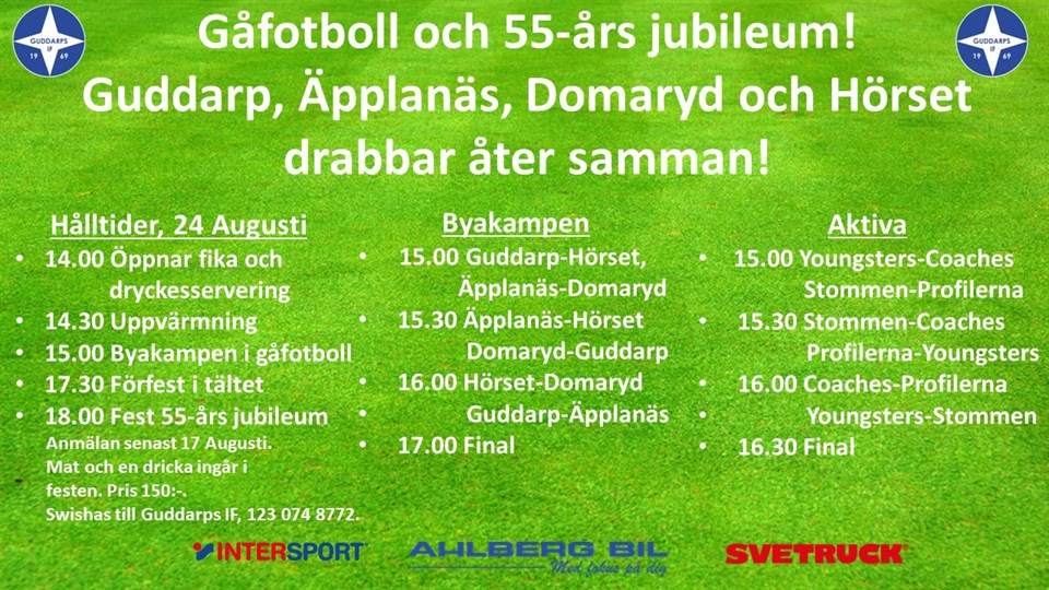 Det närmar sig nu vårt 55 års jubileum och här kommer information för dagen. Klockan 14.00 öppnar Kämpevallen och man är varmt välkommen. Både aktiva och ni som vill titta på matcherna. Fina profiler utlovas. Förutom spelare från byarna dammar vi av Keith Karlsson, Micke Gunnarsson, Robban Kraft, Per "Hoven" Hovelius, Chrille Bengtsson, Jimmy Eriksson, Pontus Blaag, Johan Kårhammer mm. Ni som ska spela bör vara på plats runt 14.00 för att få matchtröja av er lagledare. Lagledaren håller med matchtröja, övriga kläder håller man med själv. Det är lämpligt med vanliga träningsskor om det ej regnar. Då kan fotbollsskor vara lämpligt. Vid klockan 14.30 kommer Stefan Lodén från Ljungby gåfotboll och Svenska Fotbollsförbundet att gå igenom regler för gåfotboll. Efter det blir det uppvärmning samt matchstart vid 15.00. Matcherna spelas enligt planerat 2 x 8 min. Byt om hemma. Ni som har möjlighet att duscha hemma gör det. De som är med på festen på kvällen kan duscha i omkädningsrummen. Spelschema enligt nedan. Förfesten startar sedan 17.30 och festen drar igång runt 18.00. Anmälan via Swish till 123 074 8772. Pris 150:- per person och då ingår buffé samt en valfri dryck och kaffe. Man kan också anmäla sig till Anna Davidsson på sms, 073-0452057 och betala kontant på festen. Senaste dag för anmälan är den 17/8. På kvällen blir det klassikt tipsrunda samt fotbollssnack med profiler som på något vis korsat Guddarps IF´s vägar. Då hela Kämpevallen denna dag är ett slutet sällskap kommer blandade drycker att säljas till förmångligt pris. Egen sportdryck får tas med. Spelschema för byakampen: 15.00 Guddarp-Hörset, Äpplanäs-Domaryd 15.30 Äpplanäs-Hörset Domaryd-Guddarp 16.00 Hörset-Domaryd Guddarp-Äpplanäs 17.00 Final Spelschema för aktiva 15.00 Youngsters-Coache Stommen-Profilerna 15.30 Stommen-Coaches Profilerna-Youngsters 16.00 Coaches-Profilerna Youngsters-Stommen 16.30 Final